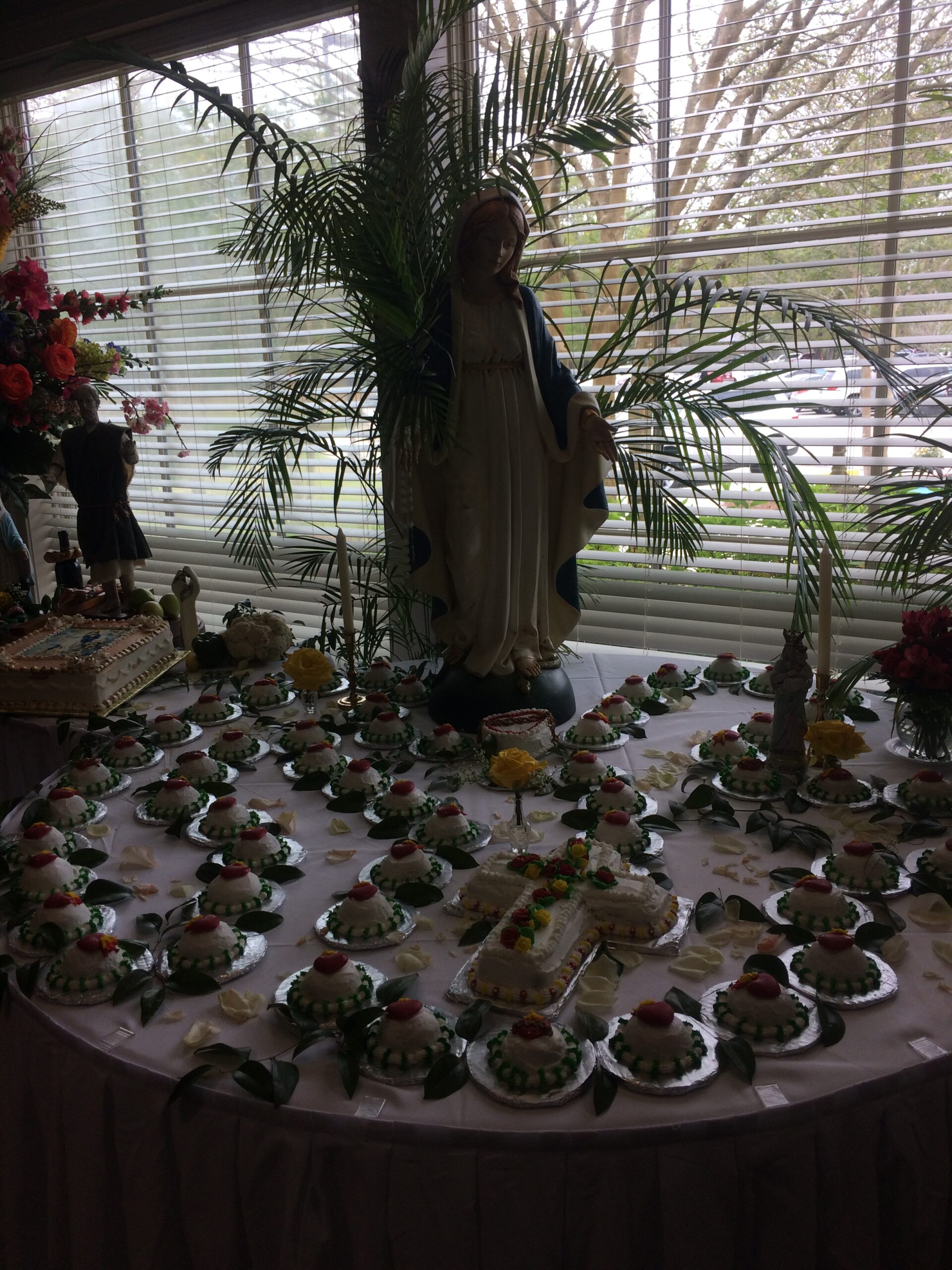 Much like St. Patrick’s Day for the Irish, St. Joseph’s Day appears to this outside observer to be more or less an excuse to throw a party during Lent. It’s a holy, philanthropic party, and it’s soberer than St. Paddy’s Day with its green beer, but it’s a party nonetheless. At the large, public altars I’ve attended, the food displayed on the altar itself will be given to the poor at the end of the day, but there is also a meal prepared to give away to anyone who comes, usually pasta with tomato sauce (of course!) and a boiled egg. There is no meat at a St. Joseph Altar because the feast falls during Lent, when Catholics historically ate no meat at all. The food is often sprinkled with bread crumbs to represent the sawdust of St. Joseph the carpenter (although at the altar we attended last Sunday, it wasn’t. This made my husband upset enough to ask if he could volunteer to help next year. I suspect he will be the official Bread Crumb Sprinkler.) Once you’ve finished your pasta and whatever vegetarian side dishes come with it, there are enough Italian sweets for every person there to rot three sets of teeth. I don’t know the names of most of them, and I couldn’t spell them if I did, but I am perfectly happy to be ignorant and just eat. As my own people would say, Mais, ça c’est bon!